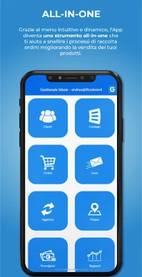 Gestionale Ideale App Agenti er en app for katalog og ordrehåndtering. Bedriftseiere får tilgang til kundelister, kontoutdrag og salgsrapporter. Agenter kan se kataloger, opprette kunder og bestillinger, også offline, samt se provisjons- og kundekontoutdrag. B2B-modus tilbyr en forenklet versjon for direkte kunder til å legge inn egne bestillinger.