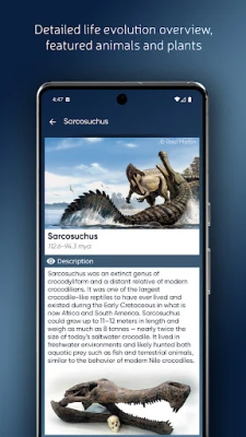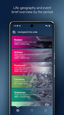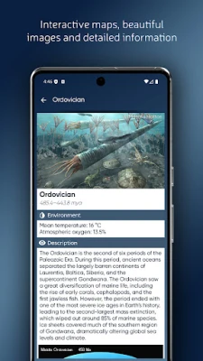 Utforsk 15 fascinerende geologiske perioder, hver presentert med detaljert informasjon om de viktigste hendelsene som har formet vår klode. Visualiser eldgamle kontinenter med interaktive paleokart, la deg fenge av et rikt billedgalleri, og lær spennende fakta om forhistoriske livsformer. Applikasjonen inneholder også en omfattende katalog over 228 plante- og dyrearter, komplett med konsise beskrivelser og viktige fakta, som gir et unikt og detaljert innblikk i den levende fortiden.