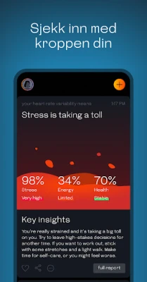 Ditt personlige dashbord i Welltory avslører klare trender og korrelasjoner i din søvnkvalitet, energinivå, humør og generelle kondisjon. Motta skreddersydde anbefalinger for å navigere utfordringer som stress, panikkanfall og søvnløshet, og dra nytte av helsevarsler som diskret indikerer når en medisinsk konsultasjon kan være fordelaktig. Welltory tilbyr støtte for utvalgte Wear OS-enheter, som Samsung Galaxy Watch4 og 5, men det er viktig å merke seg at den er utviklet for generell fitness og velvære, ikke som medisinsk utstyr. Vi oppfordrer alltid til å konsultere en lege ved fysisk ubehag eller medisinske bekymringer, da Welltory utelukkende fokuserer på HRV-måling og hjertefrekvensdeteksjon, og ikke kan måle blodtrykk eller oksygennivåer via kamera.